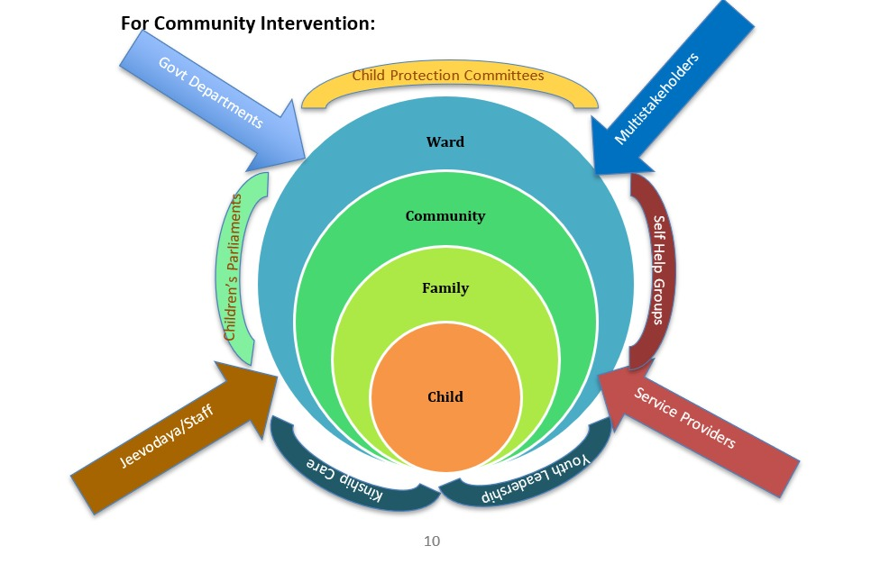 To uphold the human dignity of every child, working towards universal child rights through: Capacity Building of Duty Bearers Promoting Quality Children's Homes Rehabilitating, re -unifying and mainstreaming children in need of care and protection